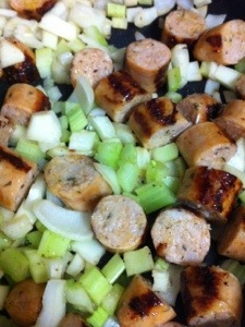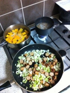 Cook sausages, then take them out and cut them up. Return to pan with celery and onion, cook a bit and then add the tomatoes, pumpkin, cooked quinoa and all the juices. Mix up a little and voila you have the easiest, really nutritious dinner!