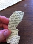 I cut large book pages lengthways, and then fold them into 4, cut some diamond and circles and whatever shapes you like, remember that to make a heart or arrow you cut half the shape in lengthways to get one. Like the trees I’ve done here.
