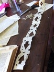 Then I cut the piece down the middle again to make two skinnier ones, and tape them all together to make a string of pretty paper! You can adapt this however you like, and it’s great for kids if you they are of scissor using age!